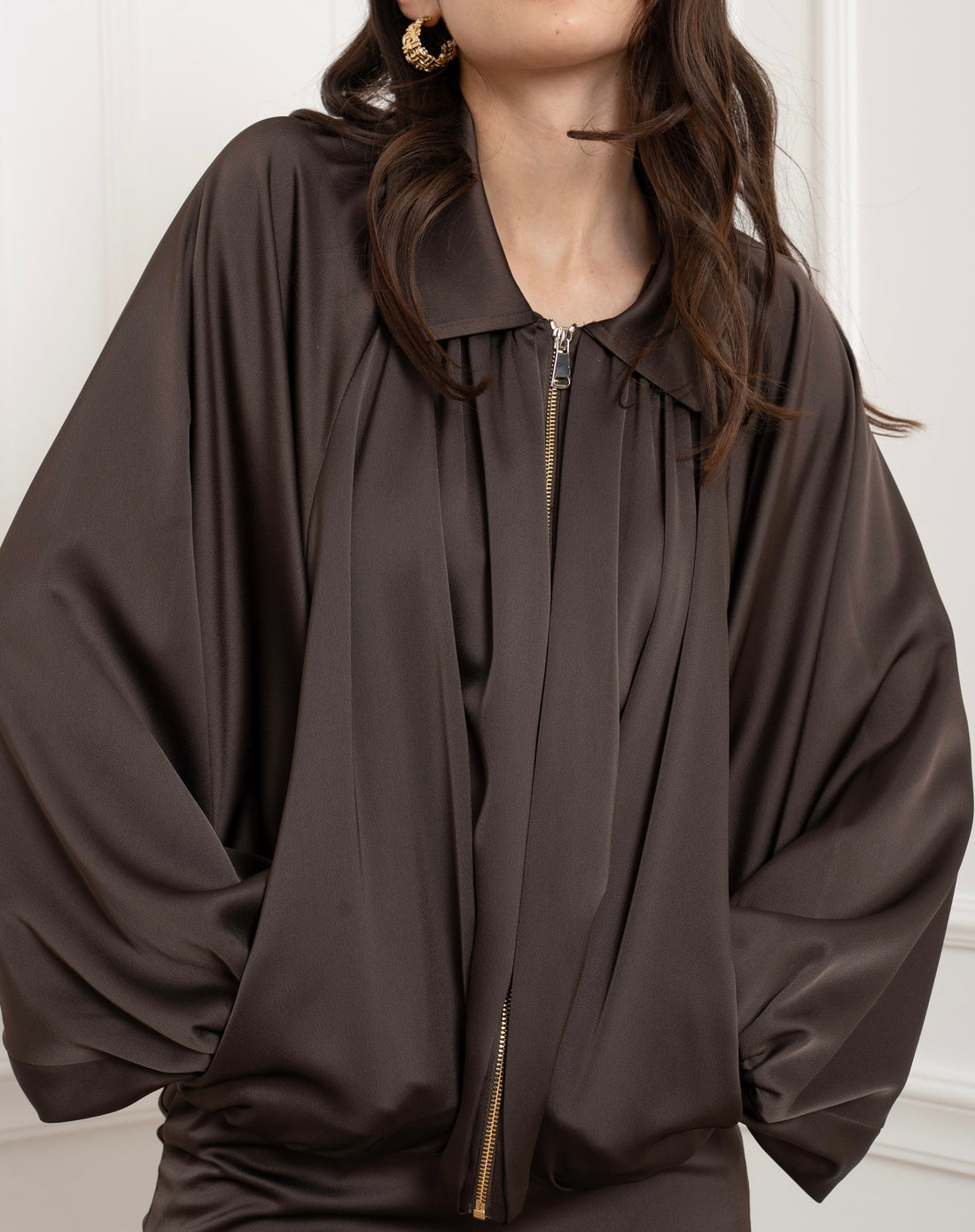 Bomber en satin couleur chocolat drapé au tombé fluide, doté de manches chauve-souris qui...