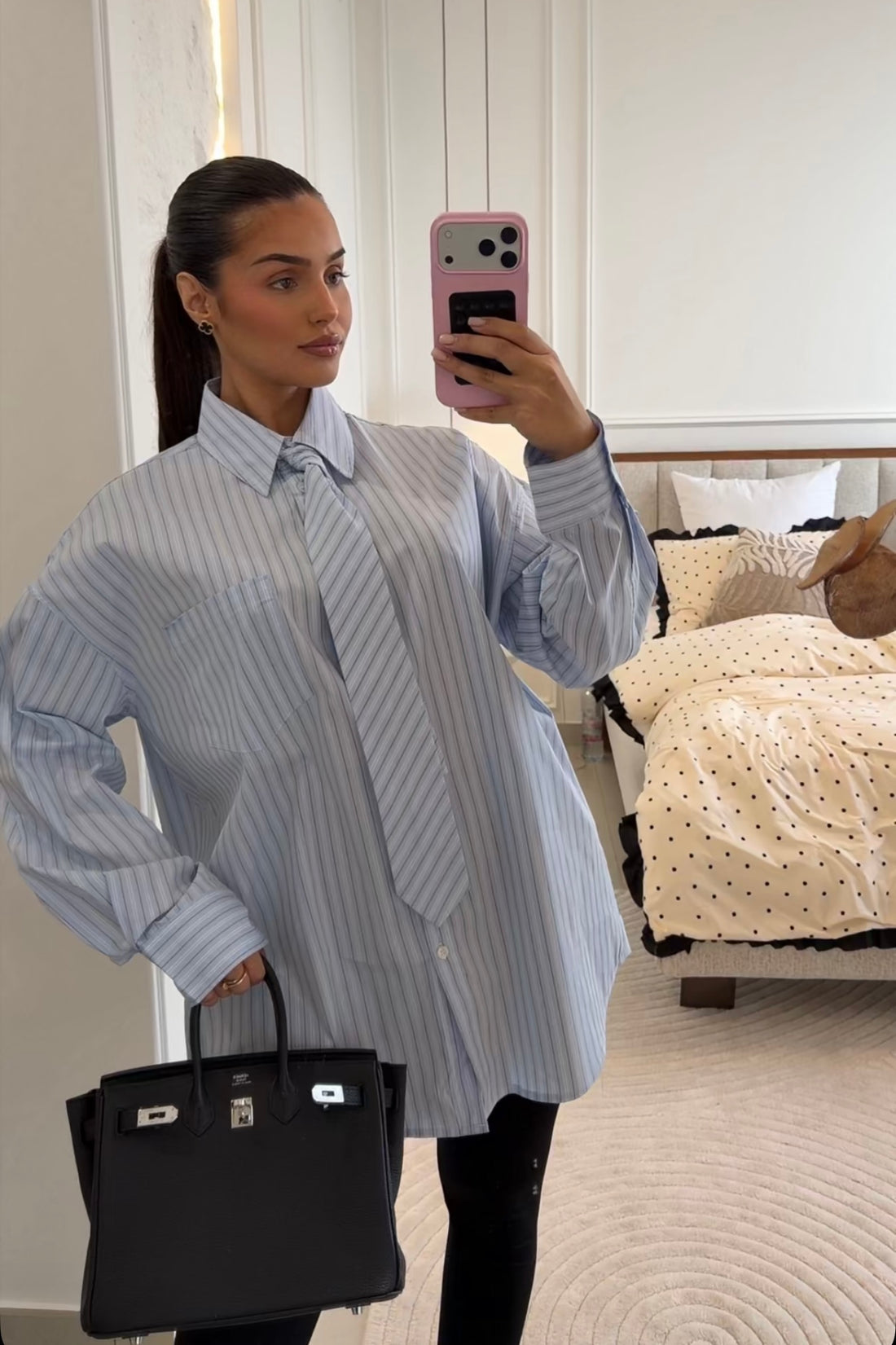 Chemise oversize à fines rayures avec cravate intégrée. Coupe fluide et allure effortless pour un...
