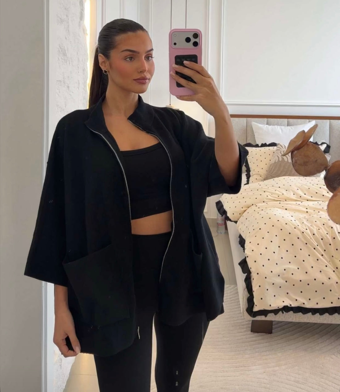 Top noir à fermeture éclair et capuche.