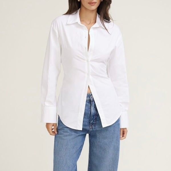 - Chemise blanche structurée, dotée de fines épaulettes et d’un lien à la taille pour sublimer la silhouette.