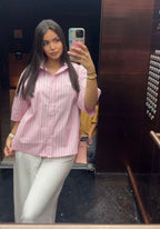 Chemise manches courtes oversize rose à rayures blanches et rouges.