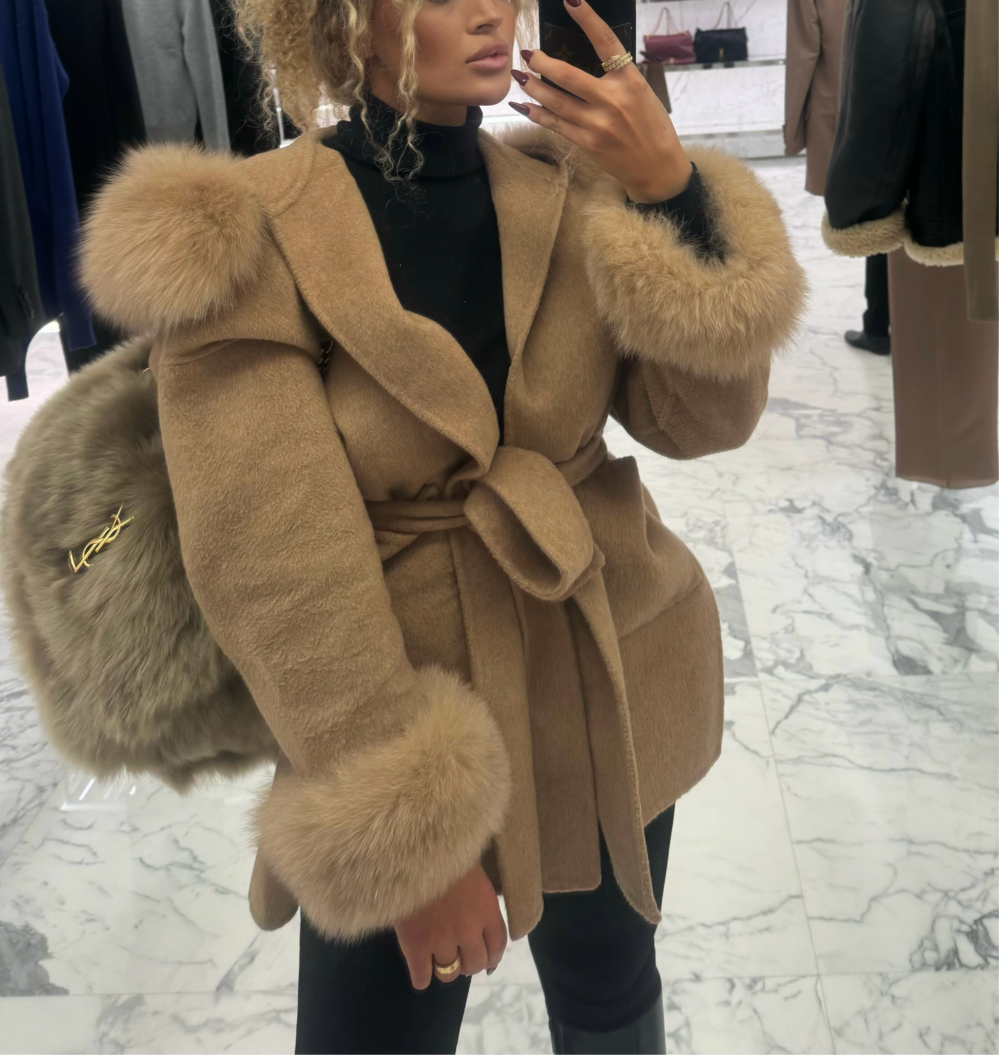 Manteau en cachemire camel à ceinture et fourrure de renard sur les manches et capuche.
